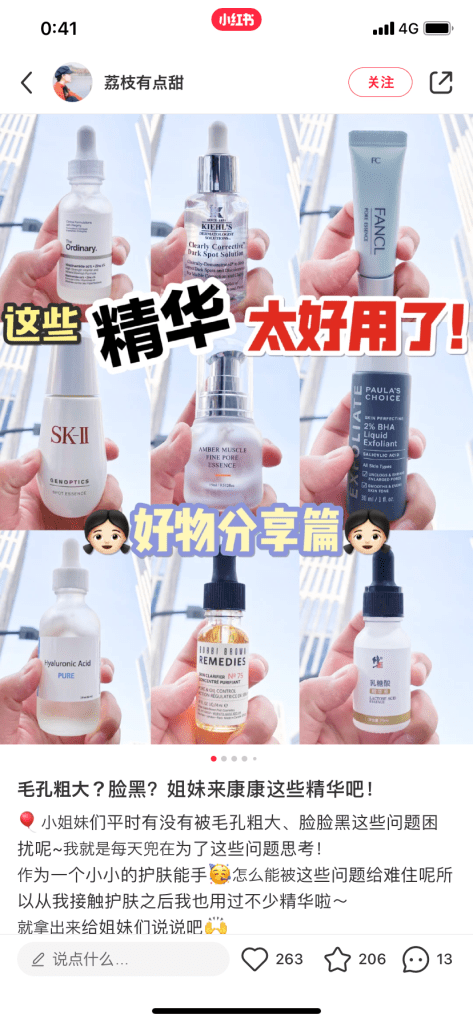 よくあるのが、「美白に効果がある化粧水10選」というようなテーマで、個人が自分が使ったことのある化粧水に対して、これはおすすめ、これはまあまあ、これはあまり効果を感じられなかったというように、率直に意見を書いて、1枚のコラージュにまとめています。化粧水、クリーム、日焼け止め、エッセンスなどいろいろあります。