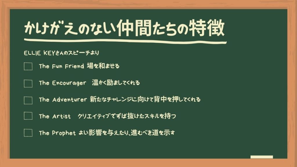 Ellie Kayさんのスピーチでは、自分を振り返るような問いかけが多く、自分や周りはどうだろうなと考えていました。